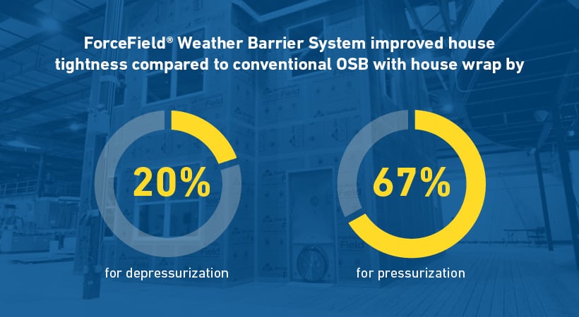 The tests found that ForceField® Weather Barrier System improved house tightness compared to conventional OSB with house wrap by 20% for depressurization (2.0 ACH50 vs 2.5 ACH50) and by 67% for pressurization (2.1 ACH50 vs. 6.3 ACH50).